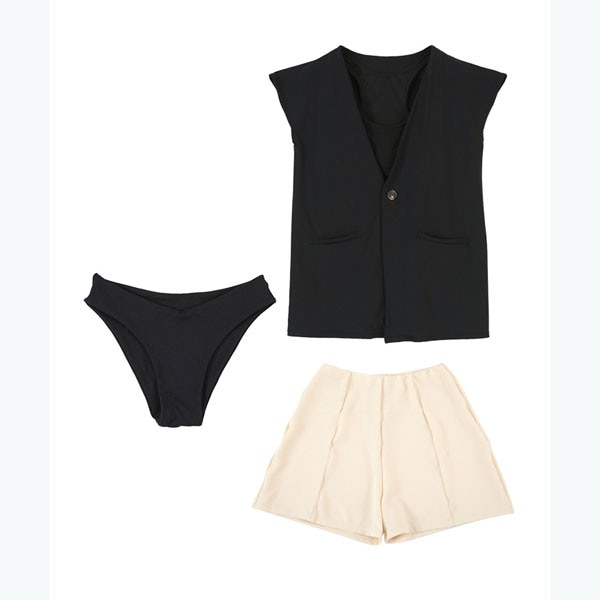 洗練されたジレトップスとトップインナーがセット構造になったデザインビキニ。