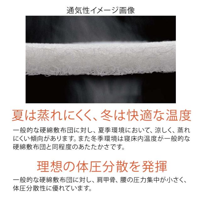 一般的な硬綿敷布団に対し、夏季環境において涼しく蒸れにくい傾向があります。また冬季環境は寝床内温度が一般的な硬綿敷布団と同程度のあたたかさです。