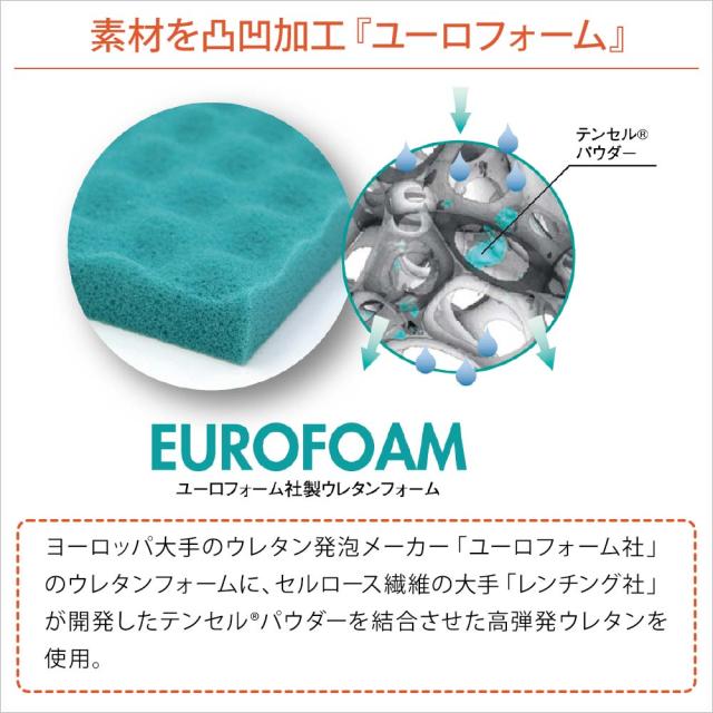 ヨーロッパ大手のウレタン発泡メーカー「ユーロフォーム社」のウレタンフォームに、セルロース繊維の大手「レンチング社」が開発したテンセル®パウダーを結合させた高弾発ウレタンを使用。