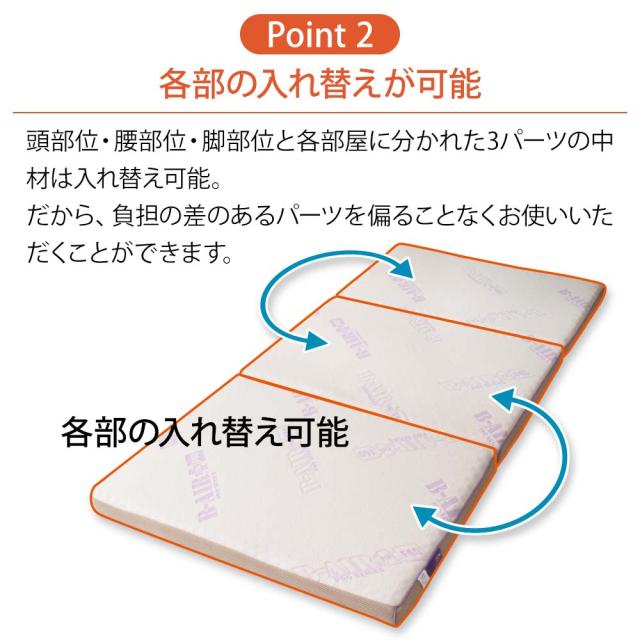 頭部位・腰部位・脚部位と各部屋に分かれた3パーツの中材は入れ替え可能。 だから、負担の差のあるパーツを偏ることなくお使いいただくことができます。