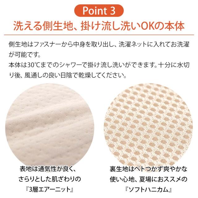 側生地はファスナーから中身を取り出し、洗濯ネットに入れてお洗濯が可能です。