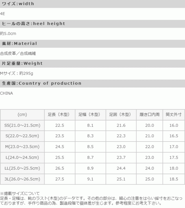 - サイズも少し大きめにしたのにふくらはぎがパツパツ。。足がこんなにも太ってるのかと再確認した。デザインは可愛いし柔らかい。ヒールの高さ太さとてもいい。歩きやすい。