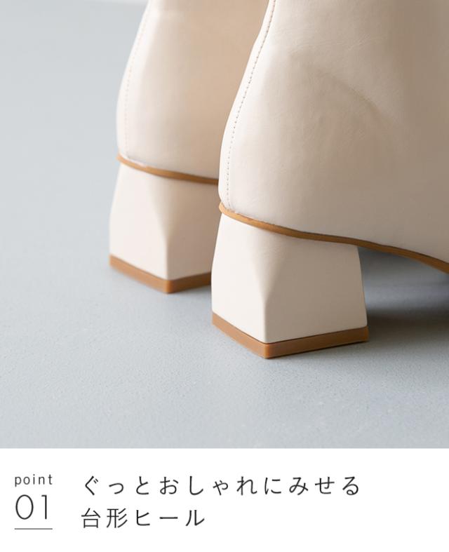 台形の形になっている変形ヒールがシンプルなディテールの中のアクセントとなり、ぐっとおしゃれに魅せてくれます。