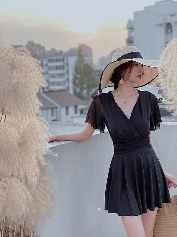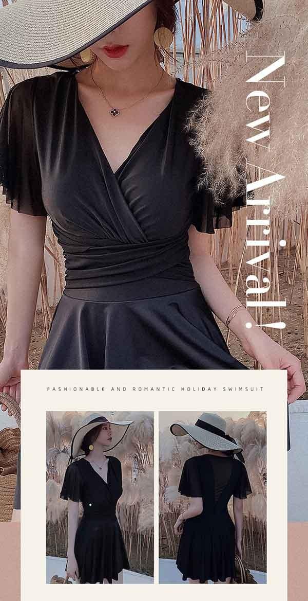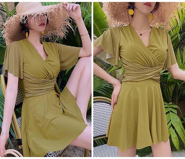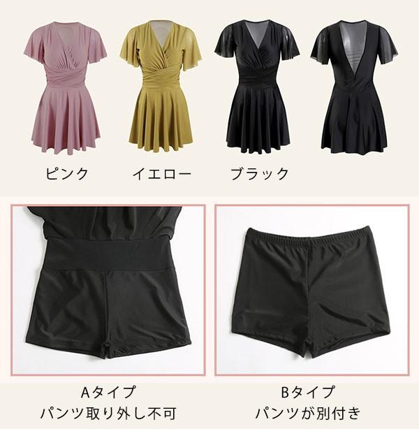 【レビュー投稿で+5%還元】ワンピース水着 ぽっちゃり 水着 レディース クロスデザイン フレアスリーブ 袖付き 痩せ見え 体型カバー 温泉 プール 海 黒 イエロー