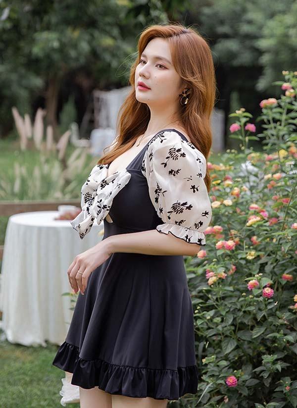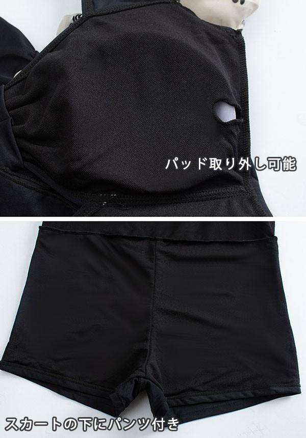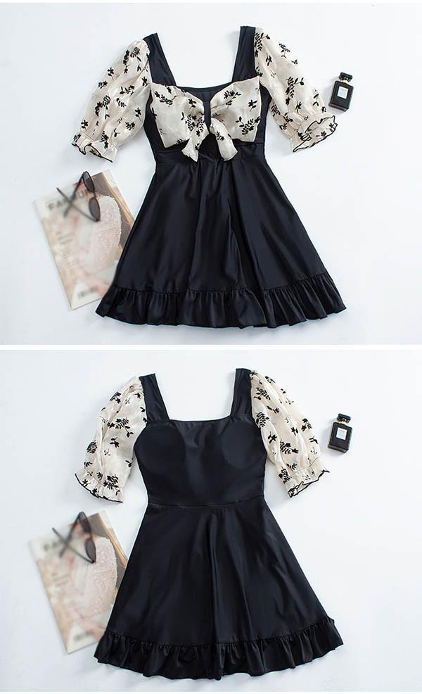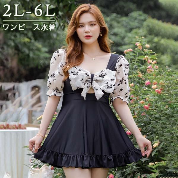 【レビュー投稿で+5%還元】ワンピース水着 ぽっちゃり 水着 レディース 大きいサイズ 韓国 ビグリボン 袖付き フリル 胸開き 体型カバー 温泉 水泳 黒