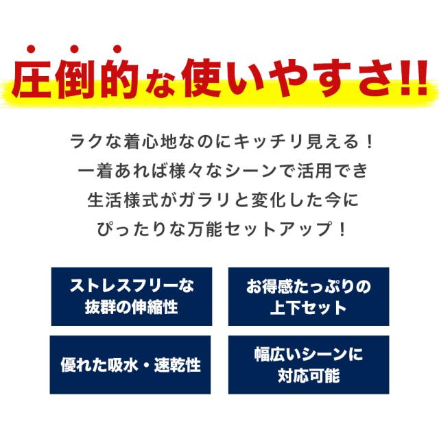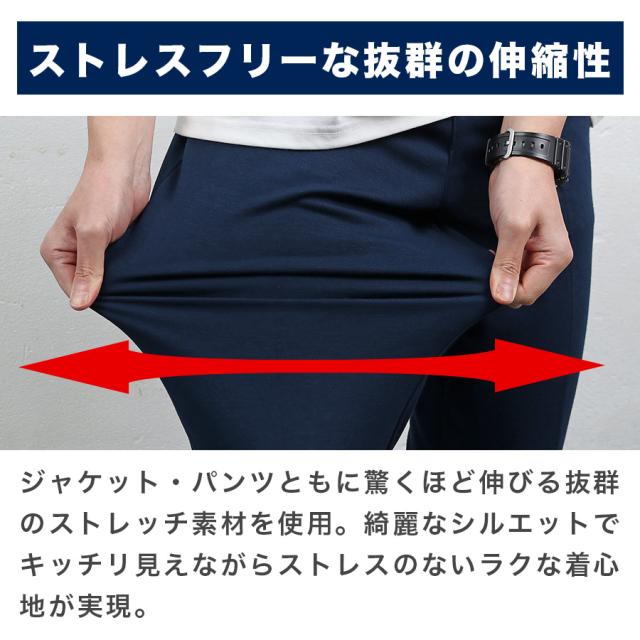 | 商品説明 | [ストレスフリーな抜群の伸縮性] ジャケット・パンツともに驚くほど伸びる抜群のストレッチ素材を使用。 綺麗なシルエットでキッチリ見えながらストレスのないラクな着心地が実現。 [お得感たっぷりの上下セット] 上下同素材のため、外に出る時もコーデに迷うことなく簡単におしゃれが可能。 無駄のないシンプルデザインでバラバラでも使えるお得感たっぷりのセットアップ。 [優れた吸汗・速乾性] サラッとした生地は吸汗・速乾性に優れておりベタつきを抑え汗や湿気を乾かせて快適な肌触りをキープ。 程よい厚みの生地感でロングシーズン対応可能。 [様々なシーンに対応可能] 普段のおしゃれ着はもちろん、ビジネスやリモートワークにも最適。 高機能のためゴルフやアウトドアなどのアクティブなシーンにも使える万能な仕上がり。 |