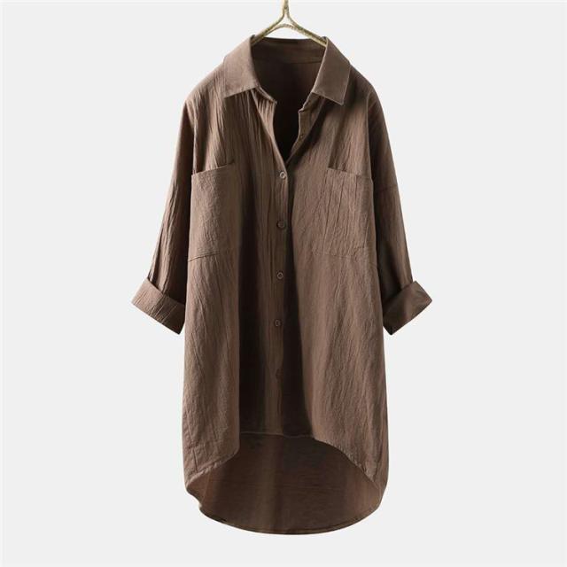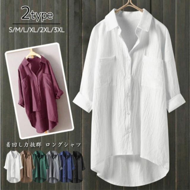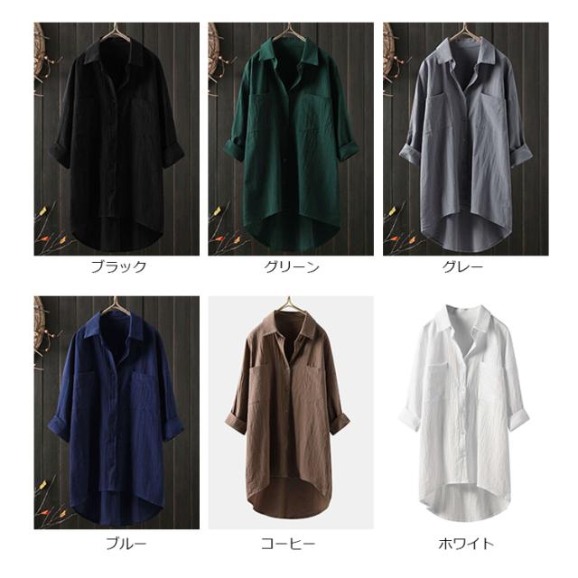 レディース 綿麻 長袖 シャツ トップス ブラウス リネン コットン アシンメトリー 長め丈 流行 おしゃれ 可愛い シンプル 無地