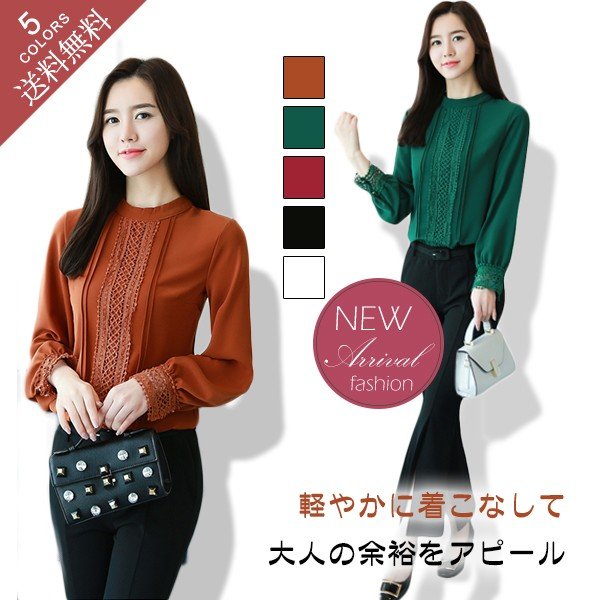 レディース ブラウス シフォン トップス シフォン ブラウス レース袖口 オフィス 通勤 大きいサイズ 長袖 ベーシック 無地 おしゃれ 春
