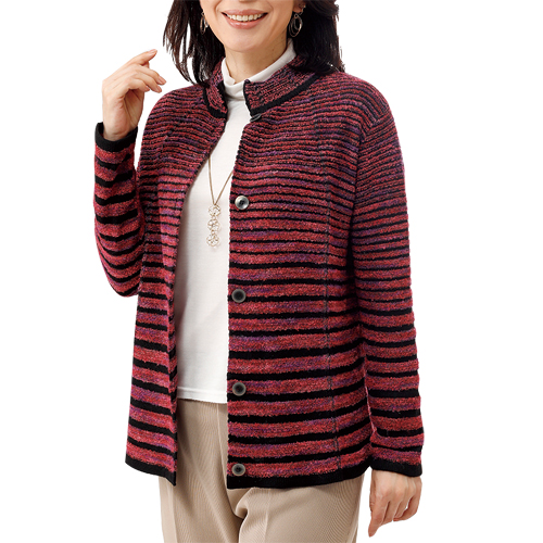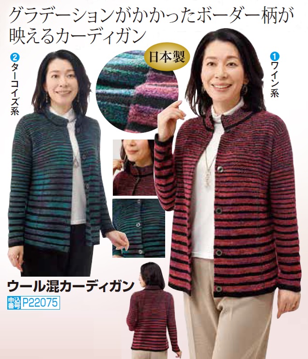 日本製 ウール混カーディガン(全2色) スタンドカラー ニットカーディガン レディース 婦人服 ミセス シニア 女性 ワインレッド ターコイズブルー 赤系 青系 ボーダー柄 縞模様 上品 シニアファッション 50代 60代 70代 80代 母の日 お母さん