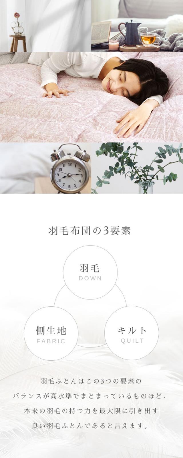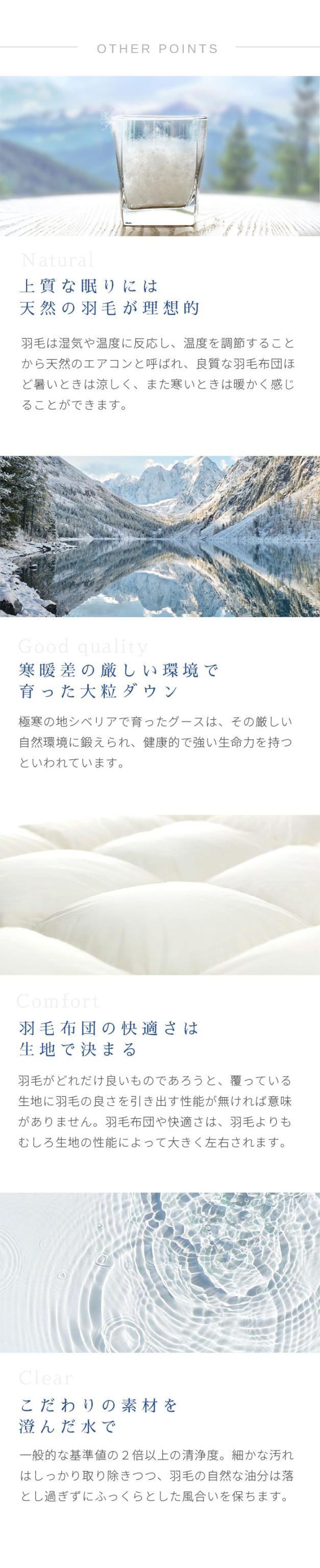 | 【西川独自の完全立体キルト】 西川独自の「ソリッドステークキルト」(完全立体キルト)は、通常あるボックスとボックスの間の穴を無くし、完全に仕切られたボックスに羽毛を詰めることで、ボックス間の移動や片寄りを防ぎます。羽毛の片寄りがなくなり、ふとん全体のかさ高が均一に保たれることで確かな保温性が生まれます。 【フレッシュアップ加工】 羽毛本来のちからを目覚めさせる西川独自の「フレッシュアップ加工」。羽毛を高温スチームでさらにふっくらさせ、その中からより良質な羽毛を選びだすことによって、空気の掴む力が上がり、保温力の高い上質な羽毛に仕上がります。加工前の羽毛と比べて、約2℃に相当する保温力が向上することが証明されました。 【マザーグースダウン93%】 マザーダウンは、長期間飼育された親鳥の羽毛です。親鳥たちは寒い冬を越すために、身体のダウンがふんわりと 大きく成熟します。大きなダウンボールはより沢山の空気を 含む事ができるので、抜群の保温力を誇ります。より暖かい羽毛布団をお求めの方に、是非選んでいただきたい高品質なダウンです。 【リヨセル使用生地】 シルクのような上品な光沢感と綿の1.5倍の吸湿性があり、水分率が高くしっとりと肌に吸い付くような手触りです。ユーカリの木を原料としているため限りなく天然繊維に近く、環境に配慮された地球にも優しいサステナブルな繊維です。 |
