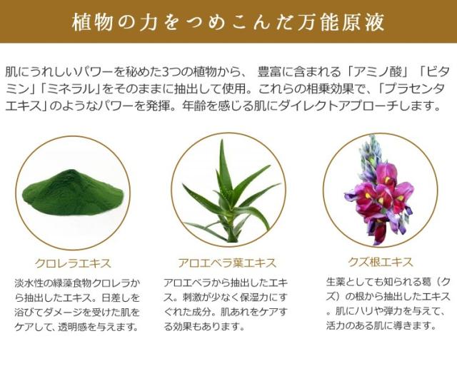 「アロエ」「クロレラ」「カッコン」などの天然植物から「ビタミン」「ミネラル」をそのままに抽出した植物性の原液美容液。