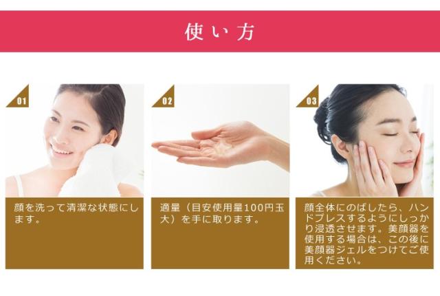 洗顔後、適量を手にとり顔全体になじませます。気になる部分には重ねづけをしてください。