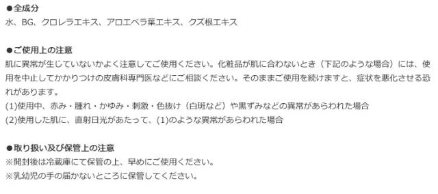 水、BG(抽出成分)、クロレラエキス、アロエベラ葉エキス、クズ根エキス