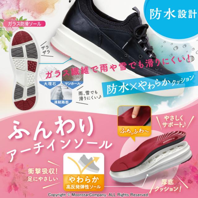 ムーンスターのレディース防水スニーカーです。軽やかで柔らかい履き心地が魅力の「レインポーター」シリーズです。「4cm4時間防水」機能と、防滑ソール搭載で、天候に左右されにくい、快適な歩行をサポートします。ヒールの高さは5.0cmで、重量は23.0cmで片足約240gです。【衝撃吸収】歩行時の足・膝・腰にかかる負担を和らげるよう衝撃を吸収する素材を使用しています。【Ag+抗菌防臭】銀イオンの抗菌作用でにおいのもととなる菌の増殖を抑制し、防臭効果を発揮します。天然由来成分で安全です。【防水設計(4cm4時間防水)】地面から4cm、4時間の浸漬状態での防水性を備えた防水機能です。【ガラス防滑ソール】ガラス(粒子、繊維)入りゴム配合で防滑性に優れ、氷や濡れた大理石でも快適に歩行ができます。(※油や小石などの異物により効果が低下する恐れがあります。圧雪された雪道路面を想定し、氷上での防滑試験を行っております。)【軽量設計】軽くなるような工夫を施した設計です。