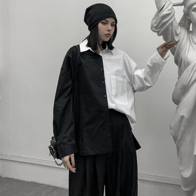 シャツ レディース モード ブラウス 長袖 トップス モノトーン バイカラー 個性的 春秋 黒 韓国ファッション