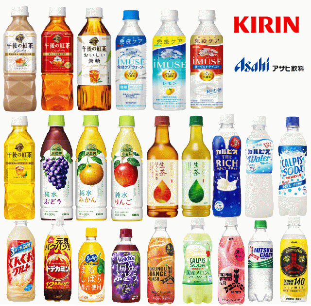 アサヒ飲料、キリンビバレッジのペットボトルの人気アイテム。果汁・乳酸菌・炭酸・健康・お茶飲料・紅茶・プラズマ乳酸菌イミューズ・カルピスなど 24種を1箱にセットにしました。