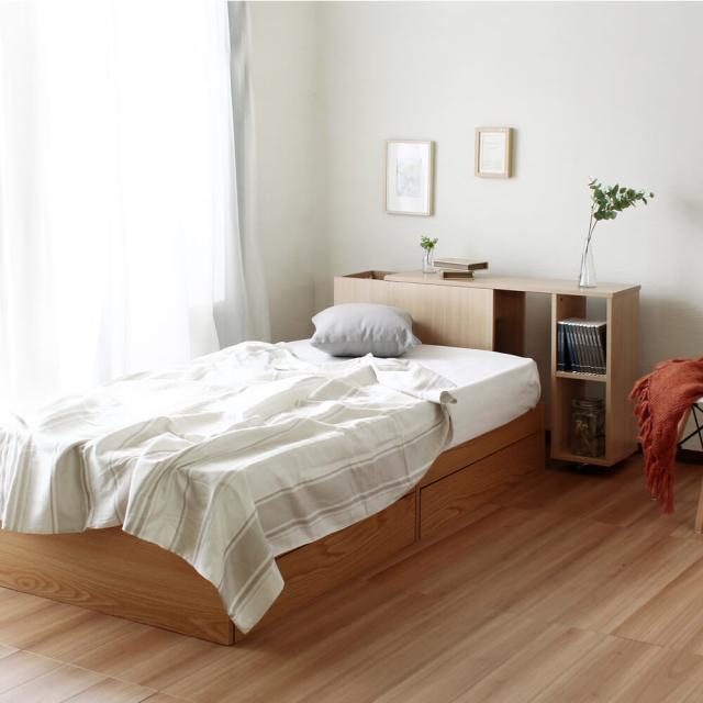 I字型では、ヘッドレスベッドのヘッドボードにもなり、デスクを引き出せば そのまま作業机としてお使いいただけます。ベッドとのパーテーション としての使用もオススメです。