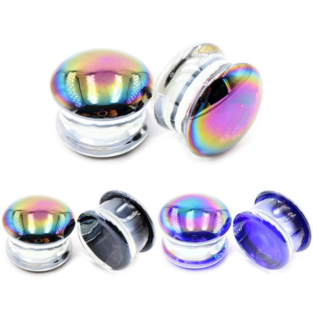 虹色の鏡のようなダブルフレア型のガラス製のプラグ型ボディピアス。