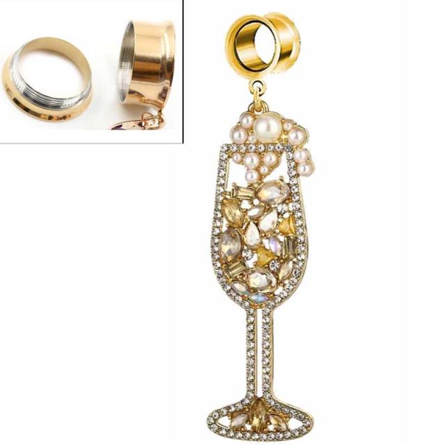 金色ゴールドのネジタイプのダブルフレアにクリスタルのジルコニアとイミテーションの真珠パールでシャンパンとシャンパンの泡をモチーフにしたのチャームが揺れるキラキラのホール系ボディピアス。
