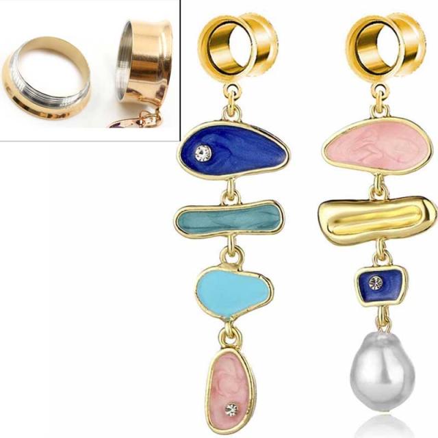 金色ゴールドのネジタイプのダブルフレアにクリスタルのジルコニアをセットしたエナメルコーティングした青色ブルーやピンク色、イミテーションの真珠パールのチャームが揺れるアシンメトリーで芸術品のようなホール系ボディピアス。