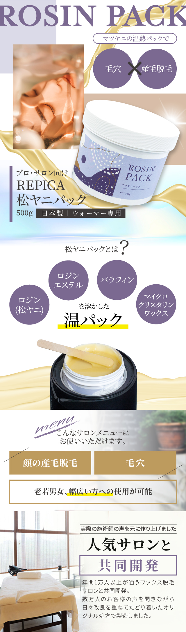 | 特徴 | ロジンパック・マツヤニパックをメニューに追加したいサロンの方へ |