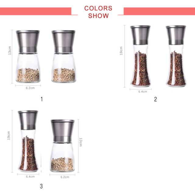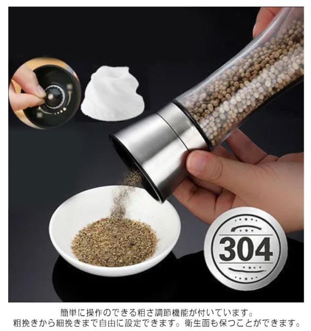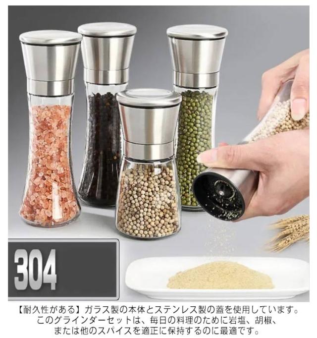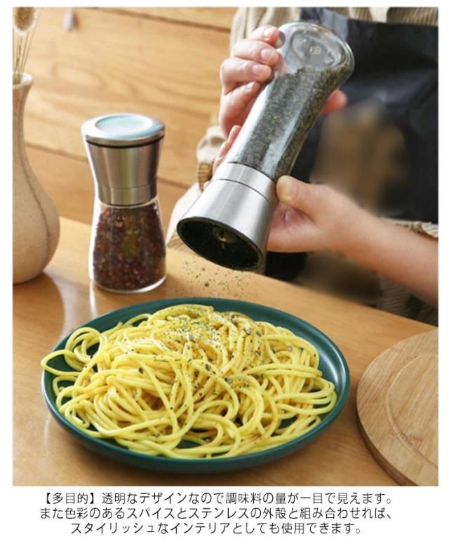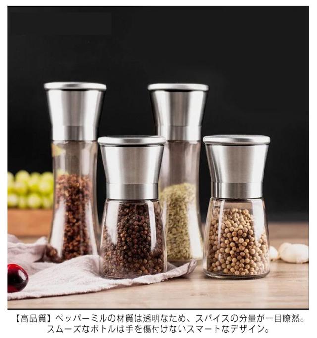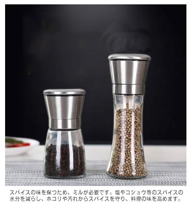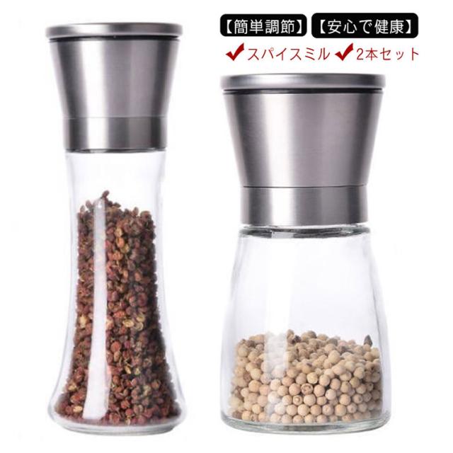 ペッパーミル ミル 2本セット スパイスミル ソルトミル 胡椒 コショウ 岩塩 塩 器具 黒胡椒 山椒 花椒 手動 花山椒 結晶塩 胡椒ひき キッチン 小物 ガラス製 おしゃれ シンプル デザイン ステンレス