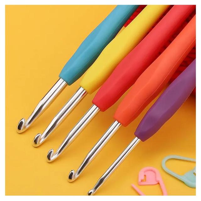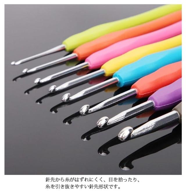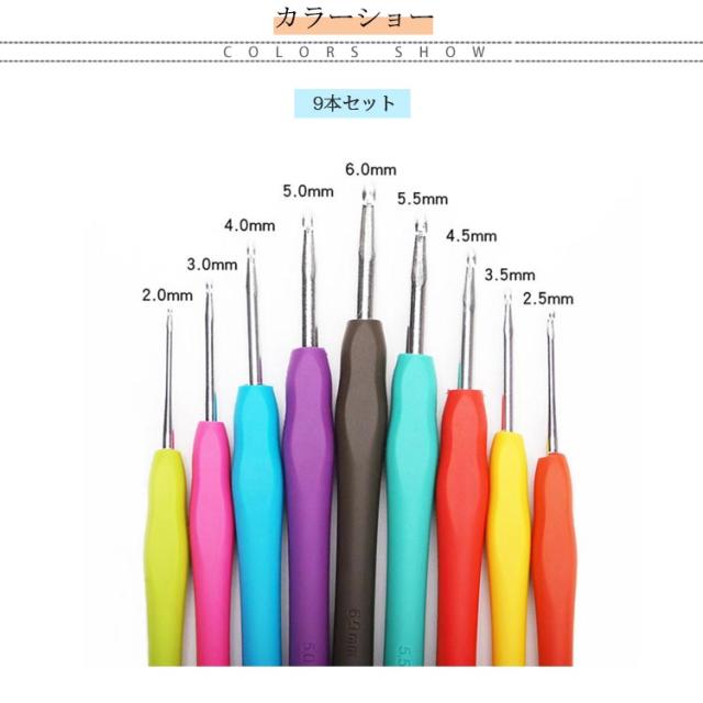 | 「編みやすい」「持ちやすい」かぎ針9本セット 初心者でも編みやすいかぎ針9本セット!2mm、3mm、4mm、5mm、6mm、5.5mm、4.5mm、3.5mm、2.5mm 針先から糸がはずれにくく、目を拾ったり、糸を引き抜きやすい針先形状です。 しっかり編める針先と、やさしい手ざわりで指にフィットする立体グリップ付き。初心者さんにも安心です。 カラフルなグリップは見た目がポップなだけでなく、号数を見分けるのにも役立ちます。 | |
