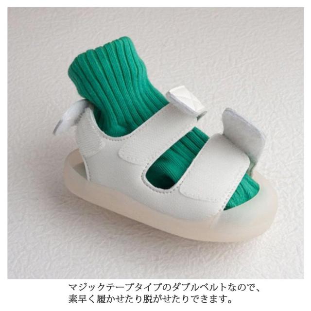 | 歩きやすくて足が痛くなりにくいベビーサンダル マジックテープタイプのダブルベルトなので、素早く履かせたり脱がせたりできます。 クッションインソールを使用し、疲れにくく足に優しいです。 グリップに優れたラバー素材のアウトソールを採用し、転倒しにくいよう配慮しているのもポイント。 つま先部分はカバーされているため歩き始めの赤ちゃんにおすすめです。 | |