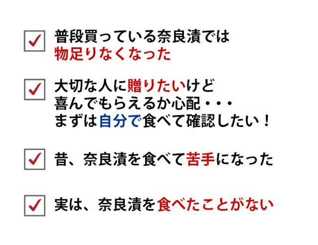 - 友人のお歳暮のお返しにと購入しました。奈良漬の好きな人なので感想を聞くのが楽しみです。お値段も手頃で大歓迎です。