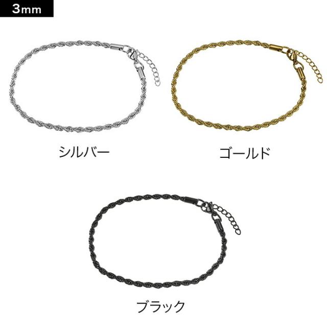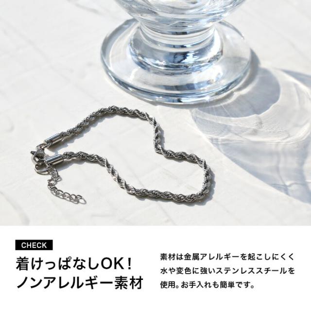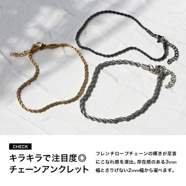 フレンチロープデザインのチェーンアンクレットです。ロープのようにねじった形状のチェーンは、光に当たるとキラキラと輝き注目度抜群です。素材には金属アレルギーを起こしにくく、水や変色に強いステンレススチールを使用しています。存在感のある幅感の3mm幅に繊細な印象の2mm幅と、コーデに応じてチェーン幅が選べます。1本だけでさらりと着けるのも様になる、細めでも存在感のあるアンクレットです。シンプルなデザインなのでペアで着けるのもオススメです。