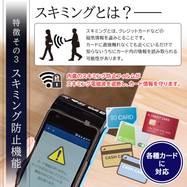 内蔵のスキミング防止フィルムがスキミング電磁波を遮断し、カード情報を守ります。
