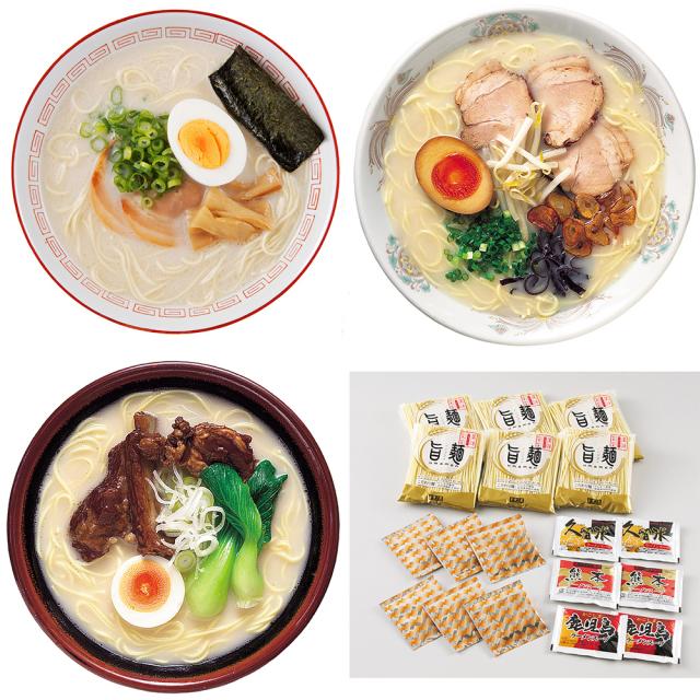 かん水を使用していない生麺を48時間熟成乾燥させ、うま味を凝縮させたノンフライの「旨麺」に、豚骨を長時間煮込み、独特な匂いと後味がたまらない久留米スープ、鹿児島の黒豚エキスを加え、旨味と風味豊かなこってり鹿児島スープ、豚骨をベースにローストガーリックの風味が効いた旨味の強い味わいの熊本スープの3種類の豚骨スープで九州の味をご堪能できるセットです。