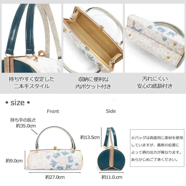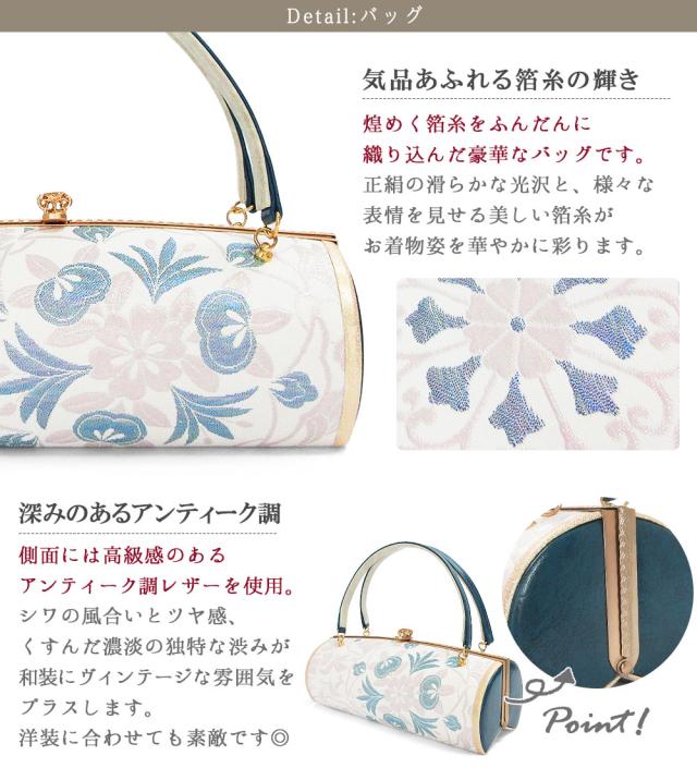 煌めく箔糸をふんだんに織り込んだ豪華なバッグは光の角度できらきらと輝き、お着物姿を華やかに彩ります。