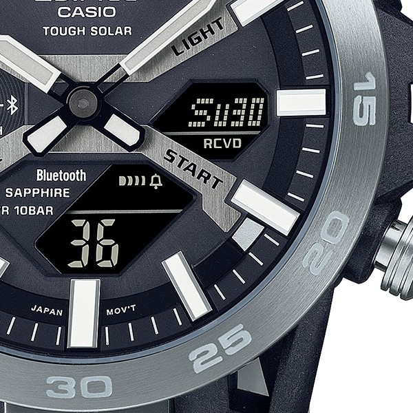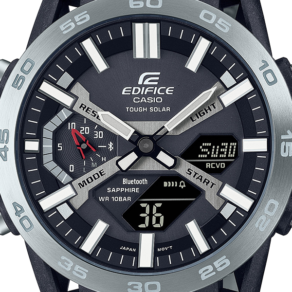 Bluetooth®によるスマートフォンアプリ接続で、自動時刻修正、ワールドタイム設定、ストップウオッチ計測データ転送、一覧表示などレーシングチームが求める必要な機能を実現しています。また、アラームやタイマーの30分前からカウントダウンを小針で表示、タフソーラーやダブルLEDライトなども搭載。傷付きにくいサファイアガラスも採用しメカニックにとって使い勝手の良い製品に仕上げました。