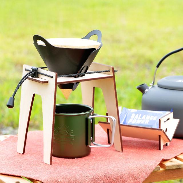 一般的なアウトドア向けマグカップにぴったりのサイズのドリップスタンドを作れるキットです。対応フィルターは1〜4杯用円錐形で、高い実用性でアウトドアに欠かせないお供になります。シート状のドリッパーは、繰り返しの使用にも十分に耐えられる、耐久性のある素材を起用しています。