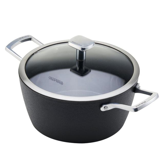 イタリア生まれの老舗ブランド「moneta」が、こびりつきにくさを追求した「ARTECH STONE ULTRA」コーティングを施した調理鍋です。天然石の粒子を含んだ中間層にマイクロクリスタル含有のトップコートを重ねた3層コーティングで、摩耗やひっかき傷に対し高い耐久性があります。ざらざらとした特殊なストーンエフェクト仕上げにより、さらに食材がこびりつきにくくなるため、少ない油でヘルシー調理もでき、お手入れも簡単です。