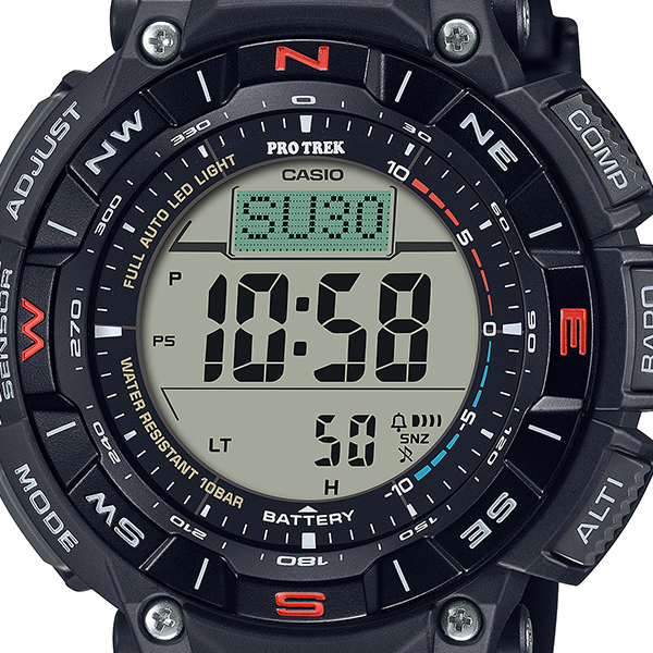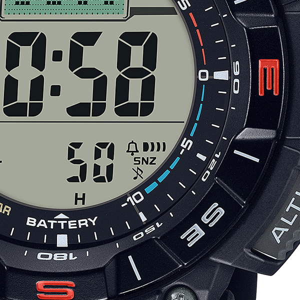 - G-SHOCKと迷いましたが、山での使用イメージどおりで大満足です。必要なデータの確認、計測がスムーズにおこなえる点も好印象です。バンドをつけたままフラットに置けるのも良い点です。