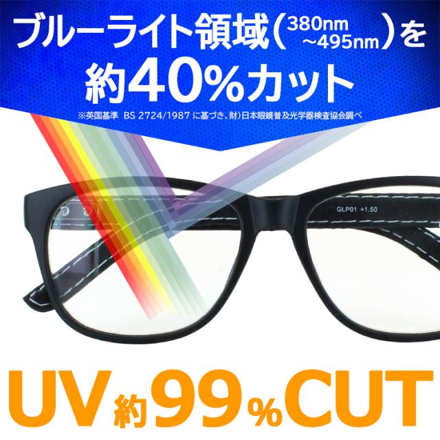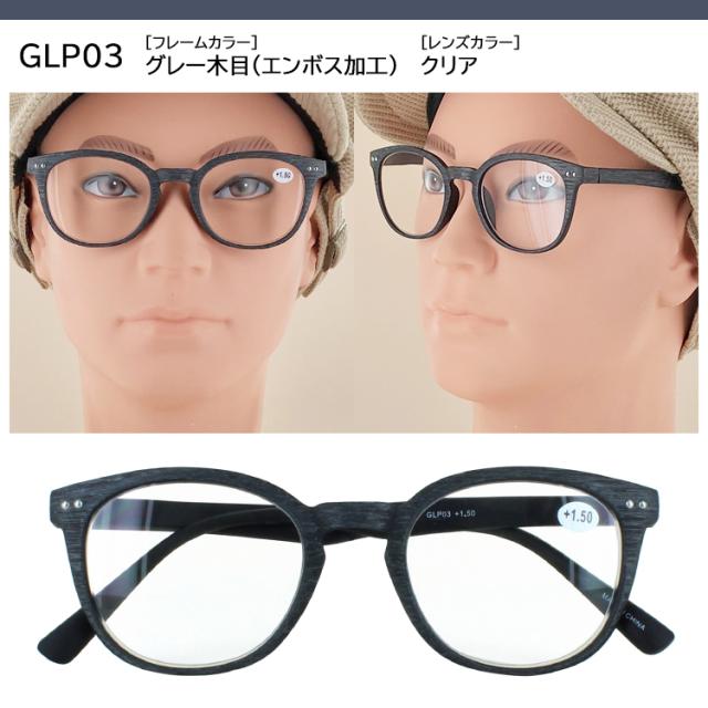 | ●フレームカラー GLP01 ブラック GLP02 デミ GLP03 グレー木目(エンボス加工) ●レンズカラー クリア(ブルーライトカット) | ●素材 フレーム:プラスチック テンプル:プラスチック(GLP01のみ合皮) レンズ:プラスチック ●機能 ブルーライト 約40%カット UV 約99% |