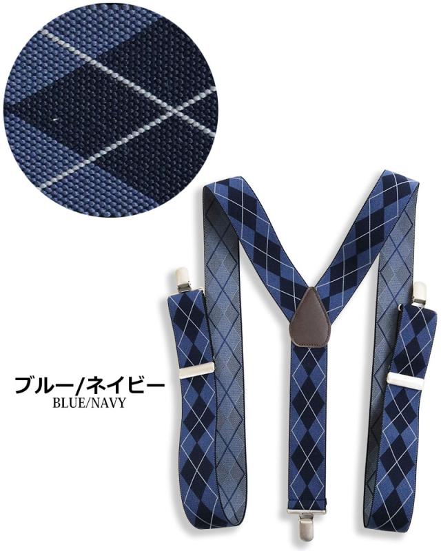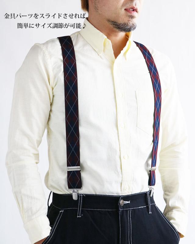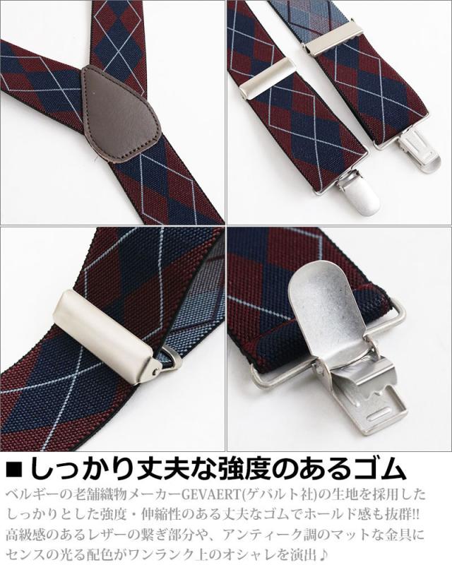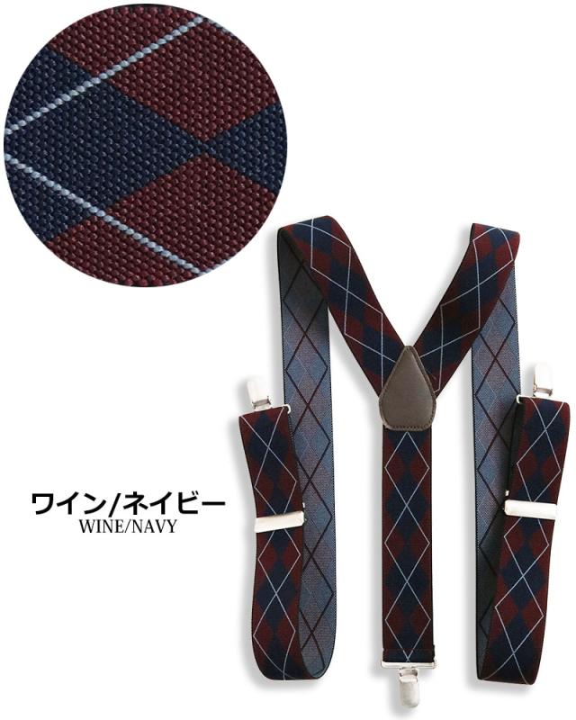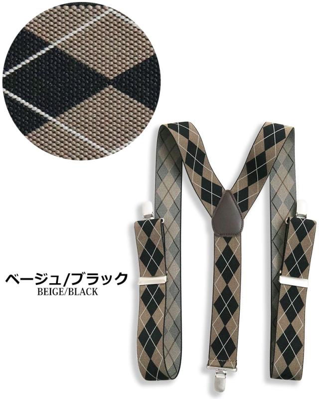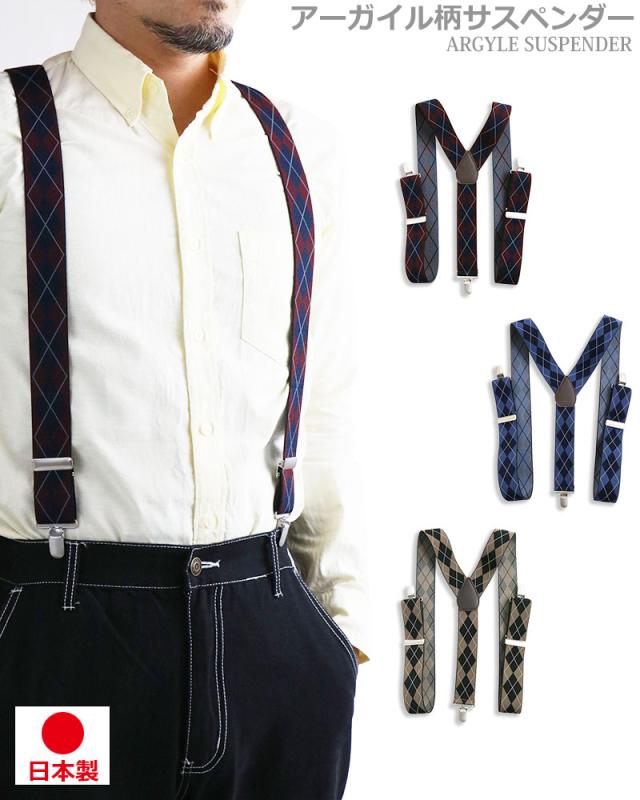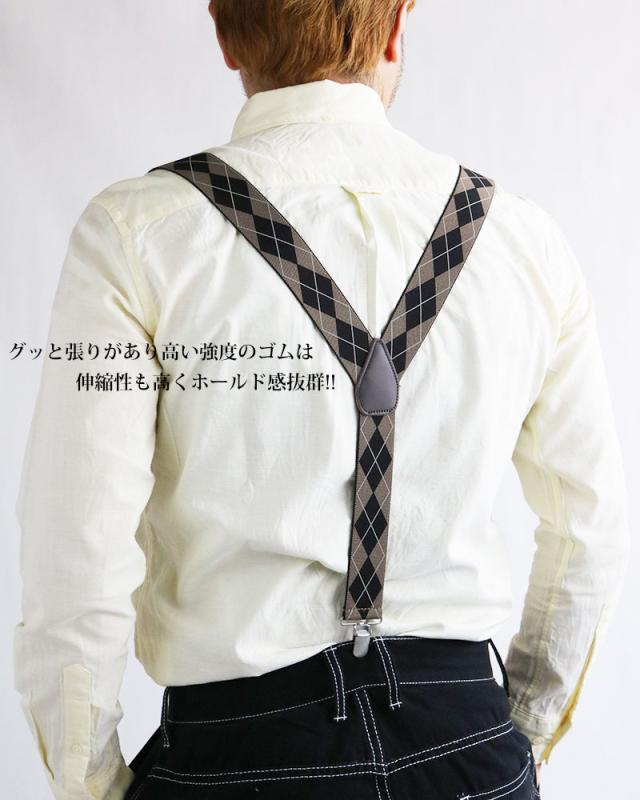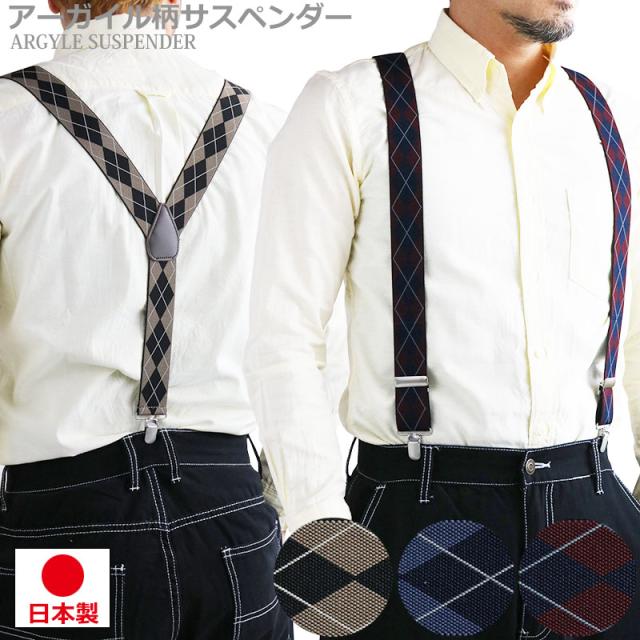 日本製 サスペンダー メンズ レディース Y型 太幅 3.5cm幅 アーガイル ダイヤ柄 ひし形 太め 35mm幅 吊りバンド ズボン吊り ブレイシーズ