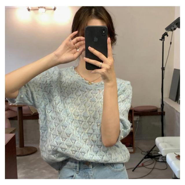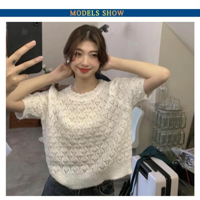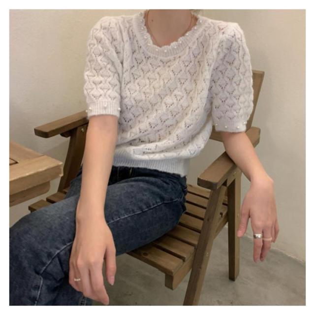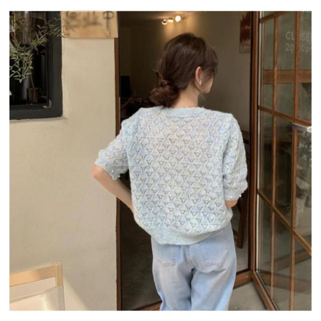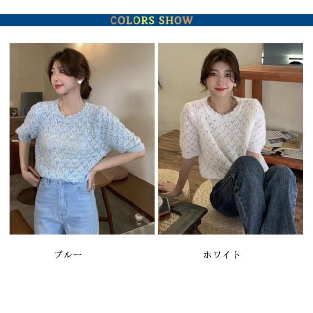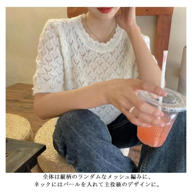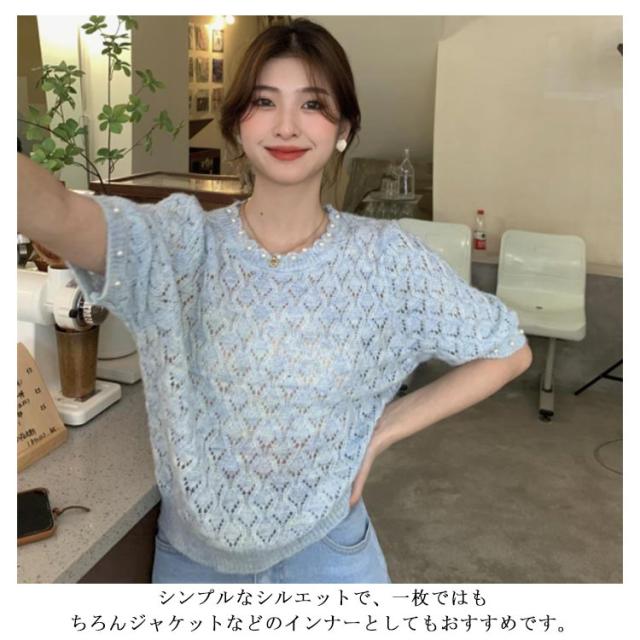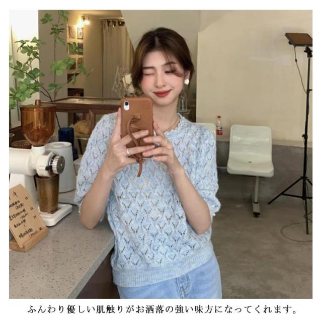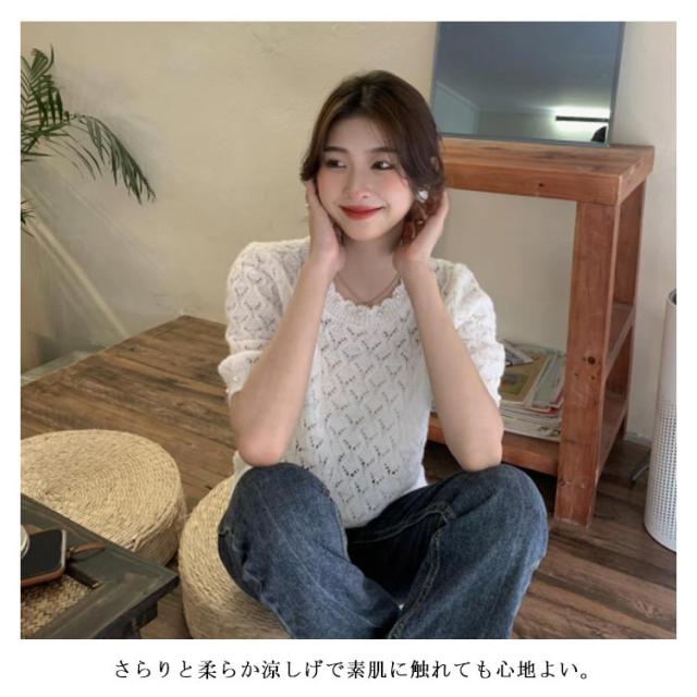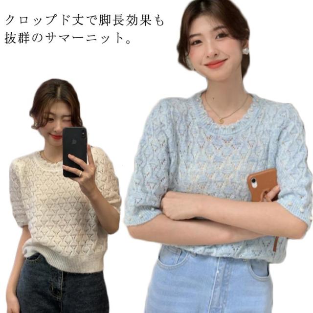 送料無料 透かし編み サマーニット レディース 春夏 トップス 半袖 五分袖 透かし編みニット サマーニット ショート丈 トップス クロップド丈 ボリュームスリーブ パフスリーブ ラウンドネック パール 鹿の子編み 薄手 涼しい