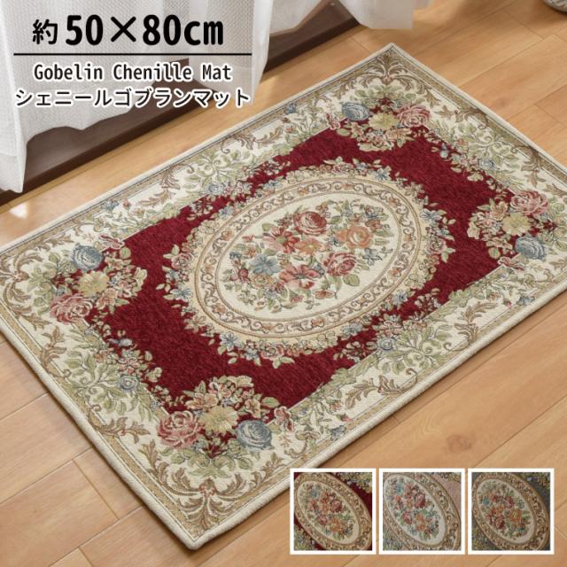 マット 玄関マット 洗える おしゃれ シェニール ゴブラン織り 約50×80cm 王朝柄 メダリオン柄 裏面不織布滑り止め付き 収納袋付き 高級感 北欧 キッチンマット アクセントマット pm
