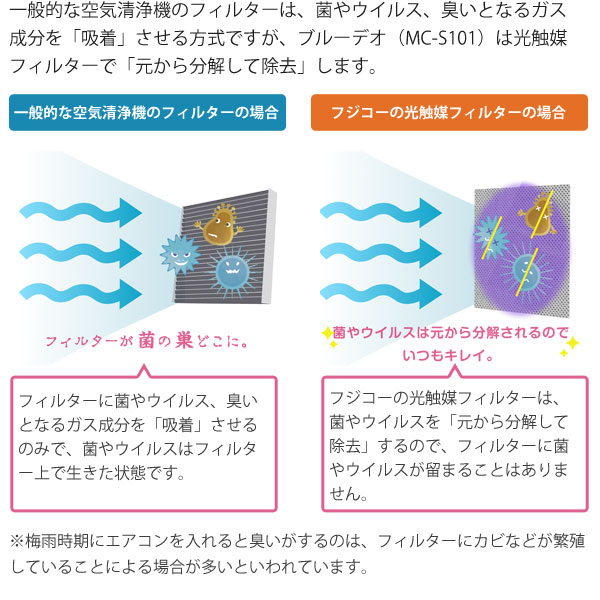 一般的な空気清浄機のフィルターは、菌やウイルス、臭いとなるガス成分を「吸着」させる方式ですが、ブルーデオは光触媒フィルターで「元から分解して除去」します。