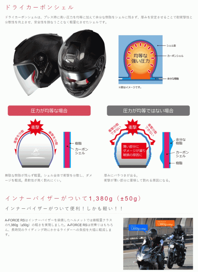 ドライカーボンシェルは、プレス時に高い圧力を均等に加えて余分な樹脂をシェルに残さず、厚みを安定させることで耐衝撃性と分散性を向上させ、安全性を損なうことなく軽量化させたシェルです。