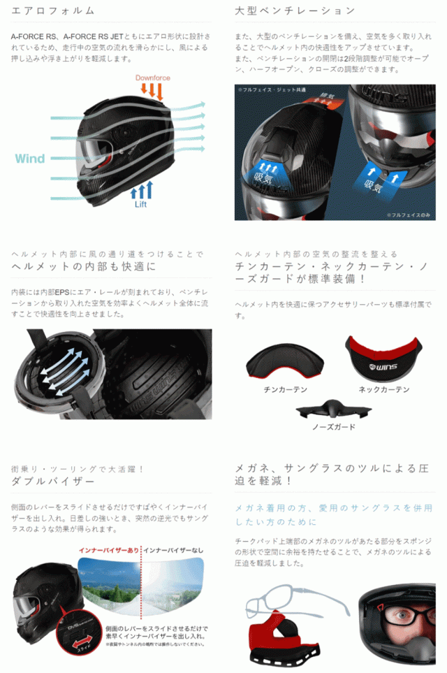 A-FORCE RS、A-FORCE RS JETともにエアロ形状に設計されているため、走行中の空気の流れを滑らかにし、風による押し込みや浮き上がりを軽減します。