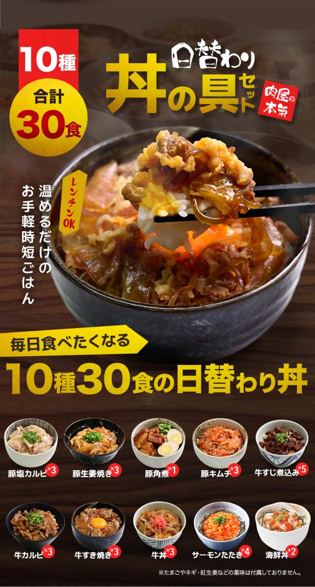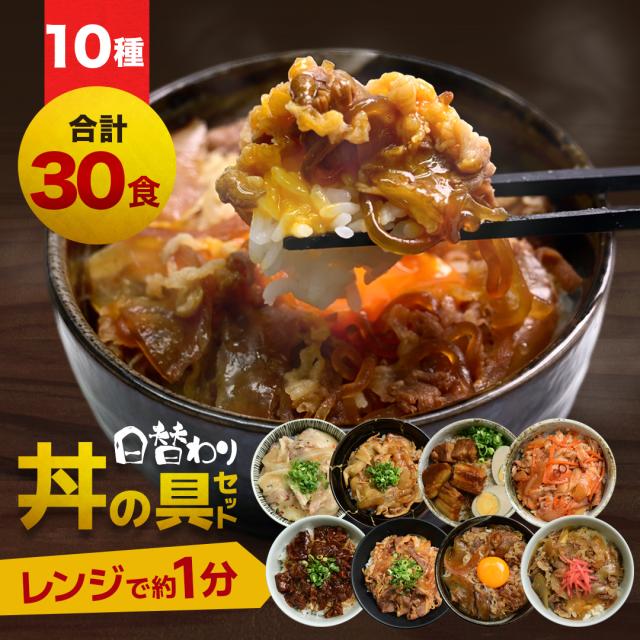 牛丼・角煮・カルビ・生姜焼き・豚キムチ 等、丼の具 10種類 30食セット【豚塩カルビ・豚角煮・牛すじ煮込み・牛カルビ・豚生姜焼き・豚キムチ・牛すき焼き・牛丼】 BBQ バーベキュー 食材