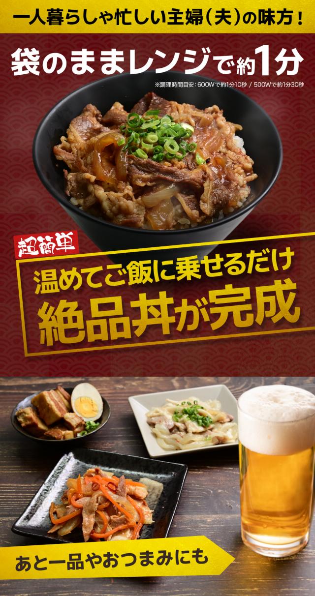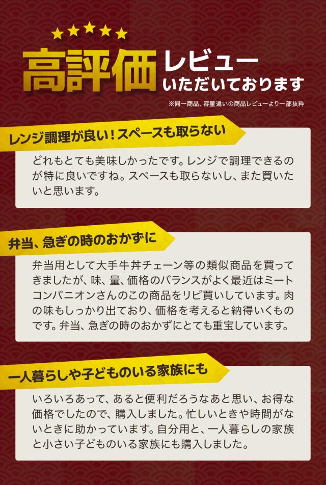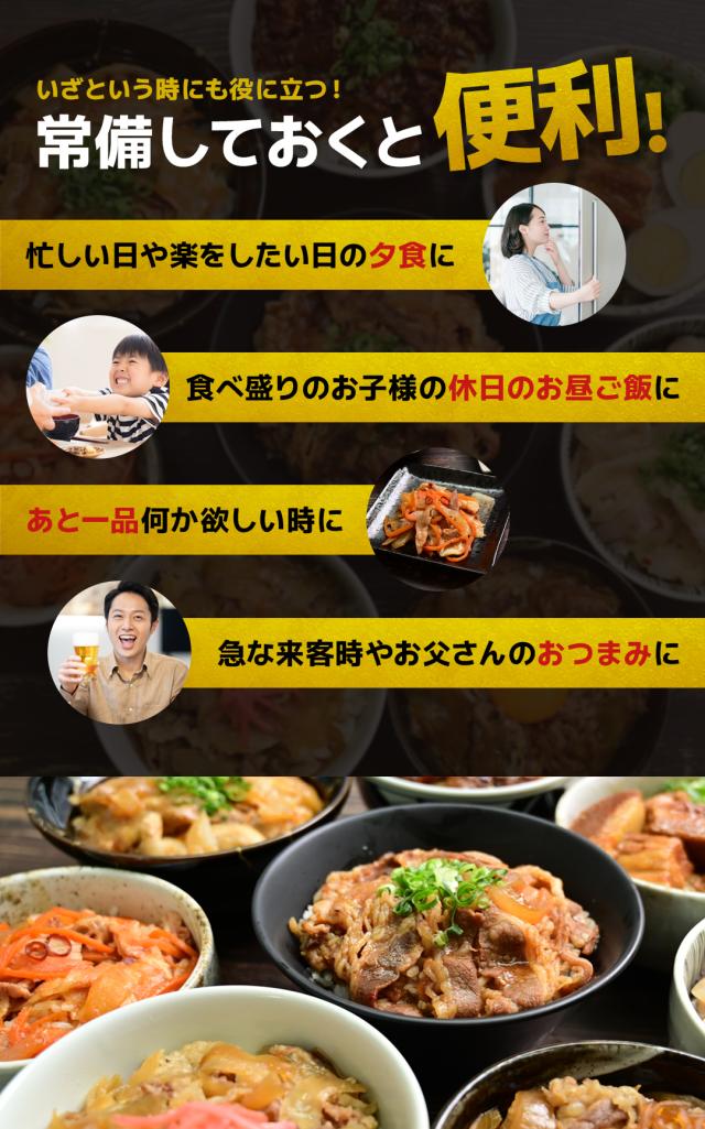 | 内容量 | 【牛丼の具】:100g×6 【牛すき焼き丼の具】:100g×6 【牛カルビ丼の具】:100g×3 【牛すじ煮込み丼の具】:100g×3 【豚キムチ焼き丼の具】:100g×3 【豚生姜焼き丼の具】:100g×3 【豚塩カルビ丼の具】:100g×3 【豚角煮丼の具】:100g×3 |