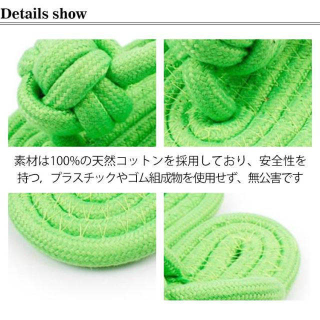 | ?安全性:素材は100%の天然コットンを採用しており、安全性を持つ,プラスチックやゴム組成物を使用せず、無公害です。 ペットは製品をより安全に単独で使用することができます。 ?耐久性:ペットの噛む本能を満たすことができて、更に丈夫で耐久性があり、噛むおもちゃはペットを長時間で噛ませます。 ?清潔用:愛犬が遊び同時に歯を磨い、清潔することができます。なおおもちゃは消耗品です ので、汚れや傷み具合に応じて定期的に新品に交換してください。 | |