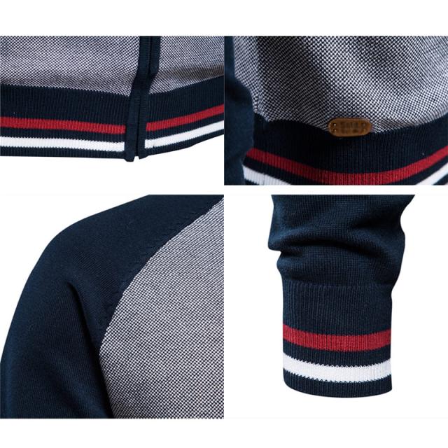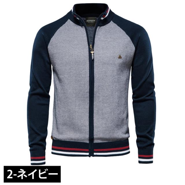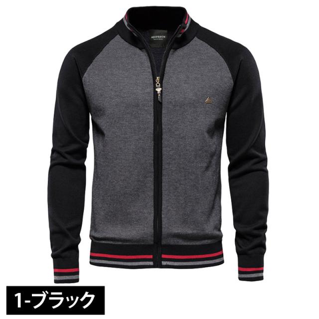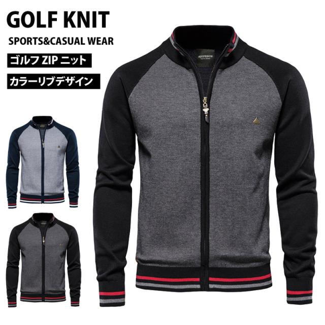 送料無料 ゴルフウェア メンズ ニット セーター ゴルフ フルジップアップ 長袖 ニットジャケット ブルソン トップス リブカラーライン 配色切替 無地 スポーツ おしゃれ 秋冬 新作