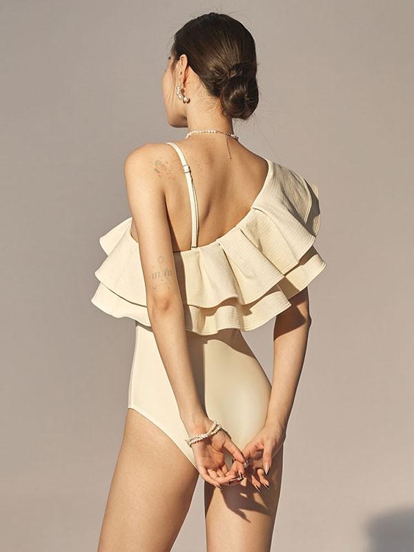 【レビュー投稿で+5%還元】ワンショルダー 水着 ハイレグ レオタード水着 レディース 韓国 フリルショルダー エンジェルスリーブ 痩せ見え 体型カバー ぽっちゃり