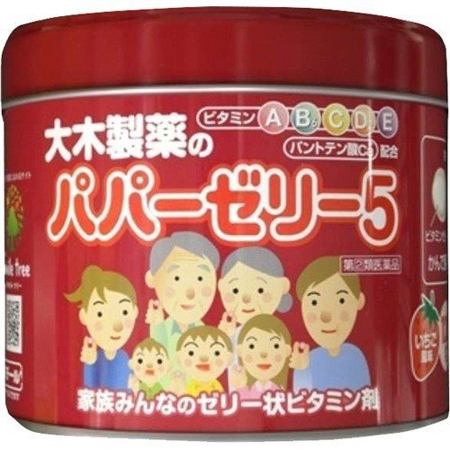 「パパーゼリー5 120粒」は、育ちざかりの幼少年期から年配の方まで、欠乏しがちなビタミンA、D、C、E、Bとパントテン酸カルシウムをゼリーの中にひとまとめにした栄養剤です。 すっきりした甘さのいちご風味のゼリータイプですから、小さなお子さまにも水なしで、かんで容易に服用していただけます。